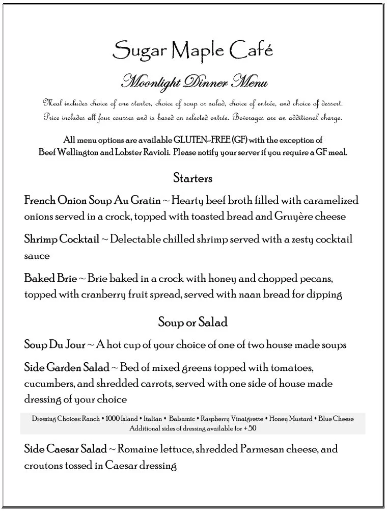Meal includes choice of one starter, choice of soup or salad, choice of entrée, and choice of dessert. Price includes all four courses and is based on selected entrée. Beverages are an additional charge.